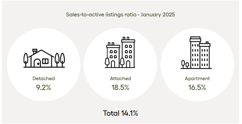 The sales-to-active listings ratio for January 2025 stood at 14.1% across all property types. When broken down by type, the ratio was 9.2% for detached homes, 18.5% for attached homes, and 16.5% for apartments. Historically, a ratio below 12% for a sustained period suggests potential downward pressure on prices, while a ratio above 20% over several months can indicate upward pressure.